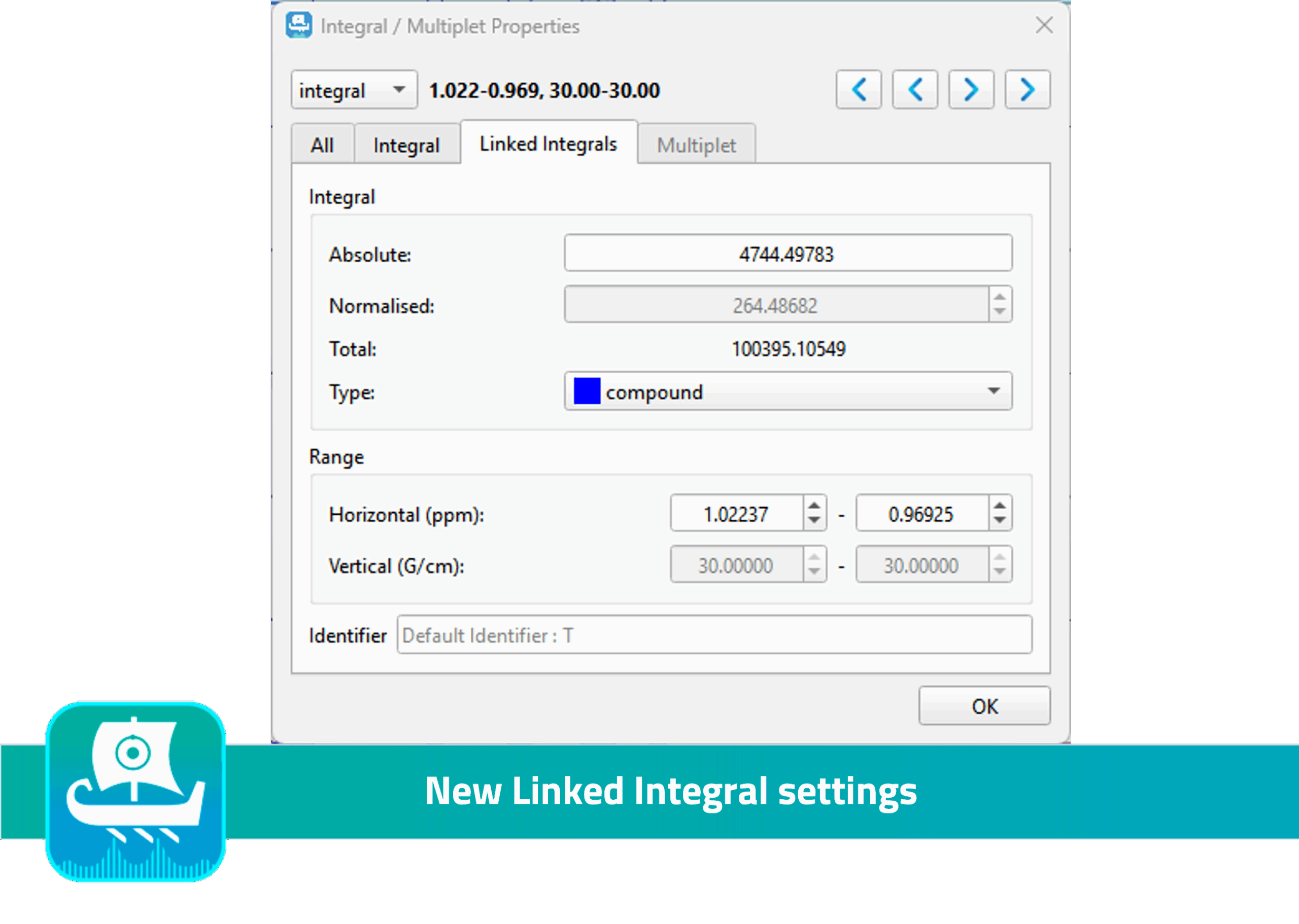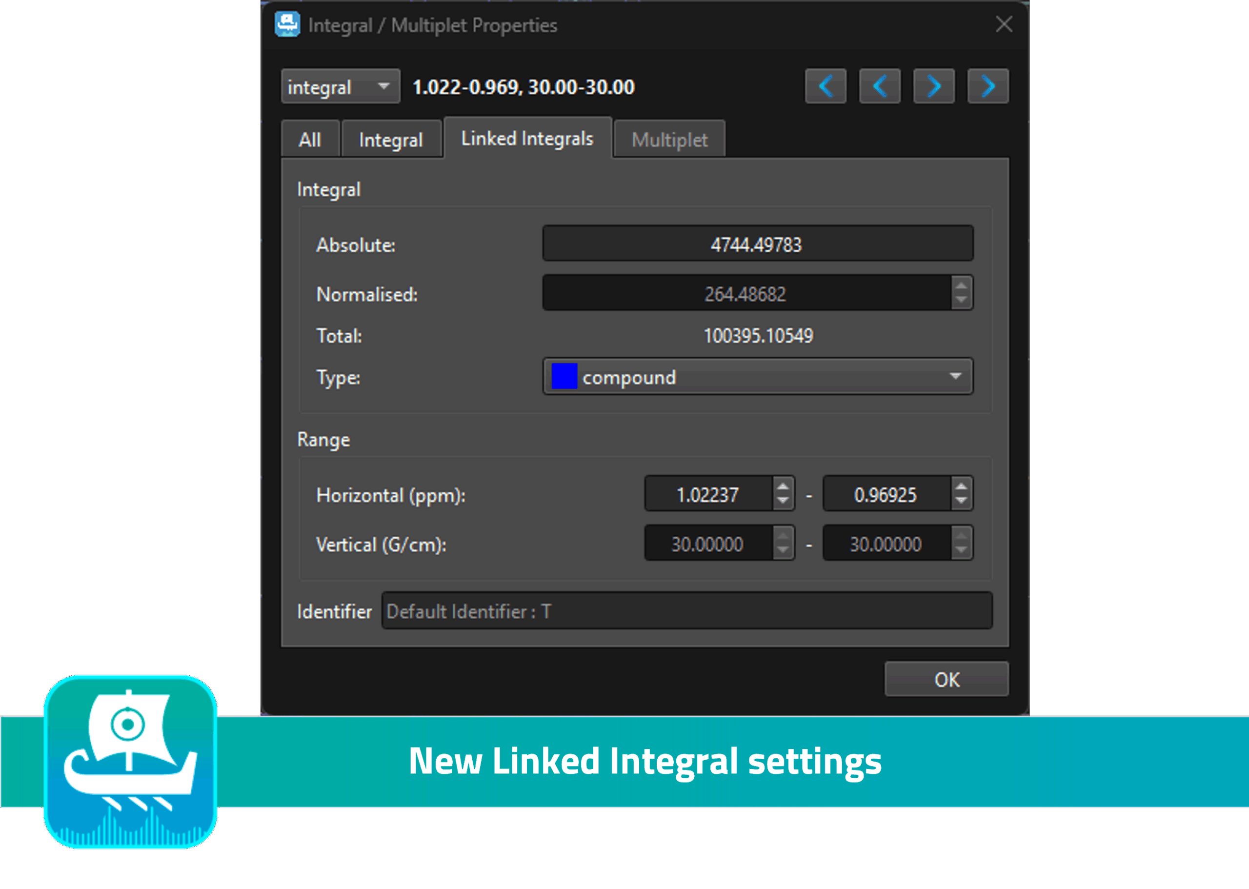 Linked Integral tab in Settings dedicated for operations on linked integrals of pseudo-2D spectra